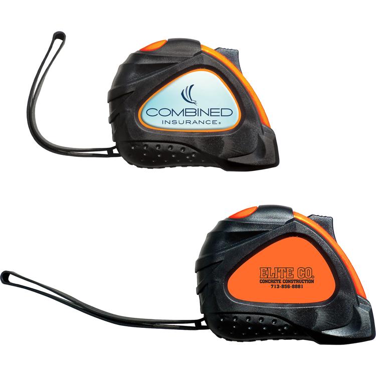 16' pull and press to lock tape measure features a comfortable rubberized finish. Wrist strap and belt clip built-in. Tape is 1" scale with 1/16" increments. A very popular promo for construction companies, builders, material suppliers, renovators, and home care companies.