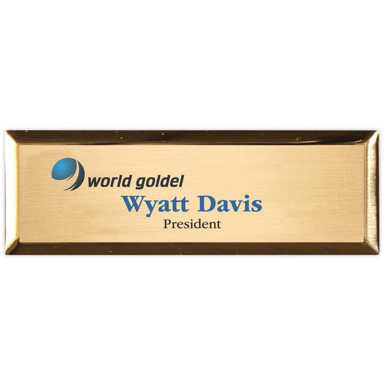 This is a high-end framed aluminum badge with a full color imprint for both the logo and the personalization. It includes up to 3 lines of personalization per piece and square corners. The standard attachment is a jeweler's pinback, but we offer a variety of options. Add a protective polydome to extend the life and enhance the beauty of this piece. Utilize our Badge Warehouse program to order in bulk and release as needed. The badge features a 1" x 3" metal frame in gold or silver.