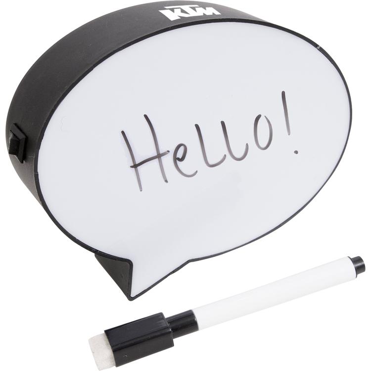 The bubble shaped Light Box lets you create your own message. Change it daily or leave the message on for long periods of time. It comes with one black wipe off marker. It includes an on/off switch located on the side of the light box and an adhesive hook and loop to mount to cubical walls. It includes 3 replaceable AAA batteries.