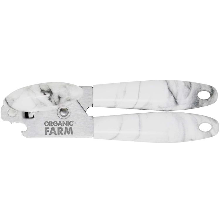 Open cans of veggies, soups and more with the Calacatta manual can opener. Equipped with plastic easy-grip handles, a large plastic twist-to-open crank, and sharp stainless-steel cutting wheel this can opener has no problem getting those cans open. It even doubles as a bottle opener. The trendy marble look finish makes this can opener the perfect addition to any kitchen. Pair that with a long-lasting laser engraved imprint and you've got a lifelong branding impression. FDA compliant. Hand wash only.