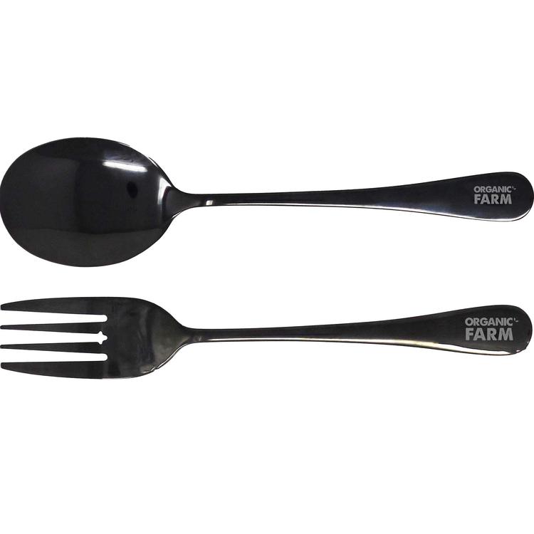 The Eclipse stainless serving set hosts the perfect sized serving utensils for everyday use or a special occasion. The fork and spoon are made from 18/0 stainless steel with a trendy black PVD mirror polished finish. To top it off, the laser engraved imprint reveals a high contrasting white making any logo stand out and look it's best. These utensils are FDA compliant and dishwasher safe.