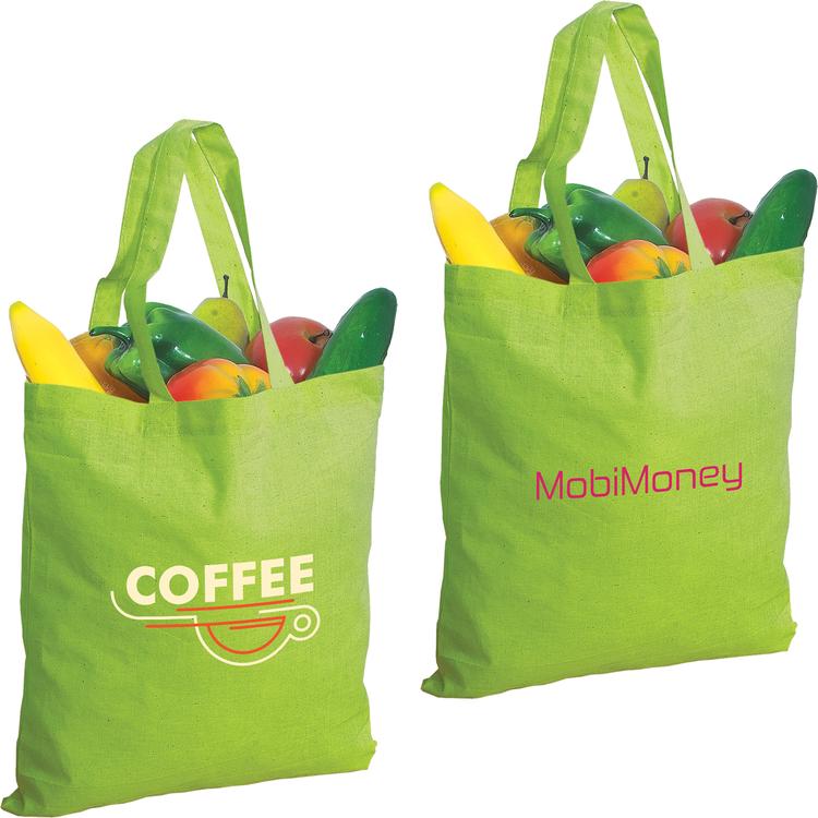 This lightweight but durable bag is made with 4.5 ounce cotton. It is inexpensive and features two 20" self-material handles/shoulder straps. Great book bag or convention tote.