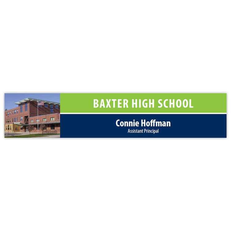 Identify your staff and give room locations with these personalized, high impact, full color desk or wall name plates. The base cost includes square corners, full color imprint, and up to three lines of printed personalization. Additional upgrade options such as round corners and attachments are available to meet your workplace needs. Utilize our Badge Warehouse program to order in bulk and release as needed.