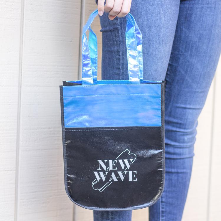 The shimmering twin of our best-selling, premium Laminated Fashion Tote! Handy mini-sized tote bag is perfect for a night out or gift-giving. It is made from 75 gram non-woven and 35 gram laminated non-woven polypropylene. The two 15" handles are 75 gram non-woven and 35 grams laminated for extra strength. The large 4 1/2" gusset is 75 grams non-woven. The tote features an outside pocket 9 1/2" W x 8" H, to help keep you organized. The lamination allows it to be wiped clean easily with a damp cloth.