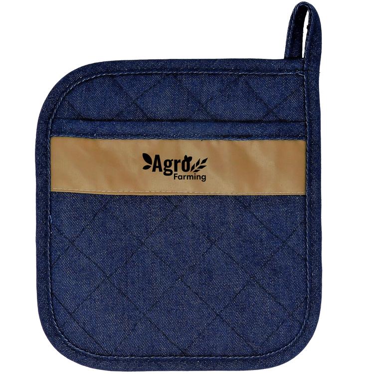 The Lindstrom quilted potholder brings an updated, modern look to a kitchen classic staple. This stylish potholder is finished with a trendy tone-on-tone denim look with an attractive cross-stitched pattern on the back side. A sleek brown vegan leather strip accents any logo being feature on the imprint area. The front side is equipped with a neoprene grip. The pot holder has been third party tested and passes ASTM d 1230-2017 flammability tests. It is machine washable and prefers an air dry. The convenient hanging loop allows for quick storage and easy access. Made from poly/cotton twill material.