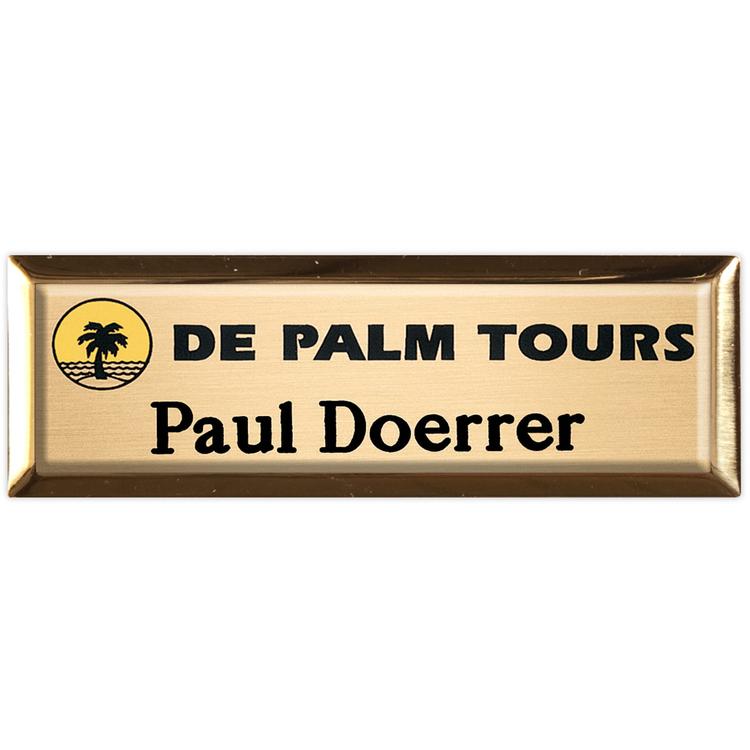 The New York Executive is a sophisticated metal framed name badge that accentuates the class of your company's logo. The brass badge includes full color graphics, 3 lines of printed personalization, square corners, jeweler's pinback, a protective polydome, and mounting to a golden or silver metal frame, all in the base cost. Additional upgrades such as magnet back are available. Utilize our Badge Warehouse program to order in bulk and release as needed.