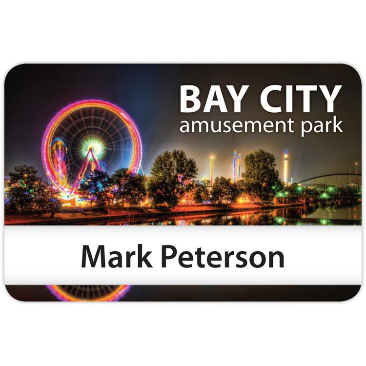 Full color graphics and gloss lamination allow the reusable Orlando to stand out above other reusable badges. The 5/8" tall window spans the full width of the badge, allowing for longer names. The crisp, full color graphics showcase your logo and graphics to their fullest potential. Perfect for a high turn-over workplace that desires a professional image as their workforce changes. The badge comes standard with a jeweler's pinback attachment and includes enough paper insert sheets to get all your badges on the floor right away. Additional attachment options are available to meet your workplace needs. Insert sheets contain 30 perforated inserts per sheet.