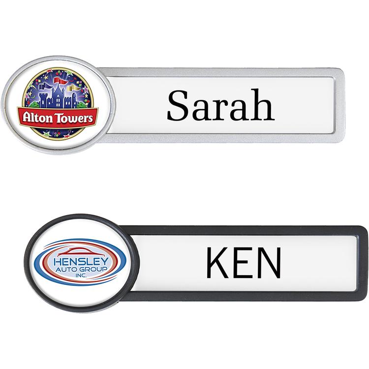 Available in black or silver, the Pittsburgh name badge is the perfect reusable option for showcasing a full color decal with polyurethane doming. The badge comes with an oval at the end of the frame that showcases your logo with a full color domed decal. To personalize, pull off the decorated end, slide out the clear plastic protector, insert the printed insert, and reassemble. The badge comes with enough insert sheets to personalize the initial order and one extra insert sheet for turnover. Best of all, this badge comes with the magnet included!