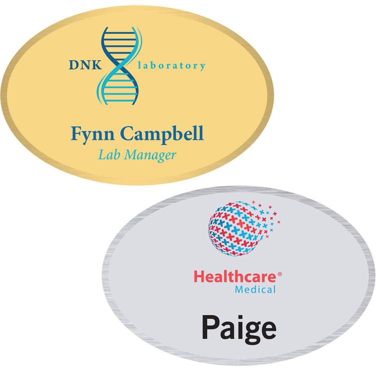 The Seattle name tag adds the sophisticated look of a framed metal badge without adding the weight. The gloss edge sets off the frosted center, allowing an extra emphasis on your logo and personalization. With your choice of .020 Frosted Nickle or Frosted Brass, you'll have a metal color that matches your look. Standard pricing includes full color sublimated graphics, jeweler's pinback, and up to three lines of personalization. Upgrades available include a protective polydome and multiple attachment options, including a magnet back. Utilize our Badge Warehouse program to order in bulk and release as needed. Please note that due to the semi-transparent nature of the sublimation imprint, white cannot be printed. White portions of artwork will show as the base material (brass or nickel).