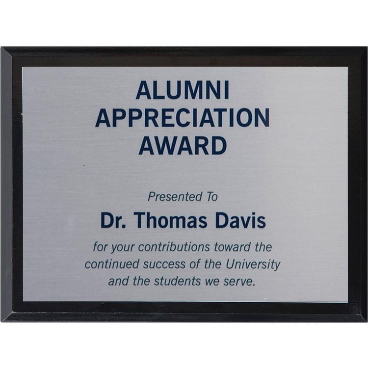 These rich sublimated plaques are perfect for awards and recognizing goals. The sublimated plaque prints in full color on a white, gold or silver metal plate. Imprints are semi-transparent, base metal may show through the colors. White ink cannot be printed. The metal plate then adheres to a handsome black wooden base which can be hung on the wall or stood on a desk. Art shown is for presentation purposes only. Client must provide artwork.