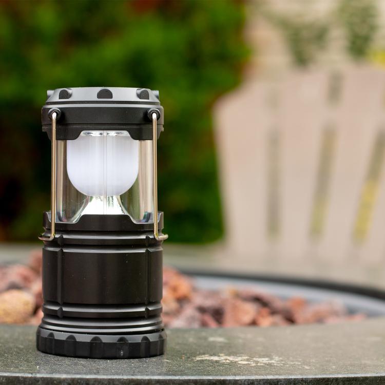 This one will light up the tent or room! Metal loops for hanging and transporting. Expand the lantern to turn on the 6 bright LED lights and collapse it to turn it off. It comes with three replaceable AAA replaceable batteries.