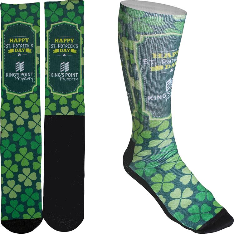 Here's a product with some socks-appeal! The socks are printed in full color dye sublimation on both sides. The design can be different on each side of the sock at no additional charge. The socks will have a black sole and a?ribbed top. Fits men's shoe sizes 10-13. The socks are decorated to look the best before putting on the foot. The art may distort when placed on the foot, with the white ribbing showing through the imprint. Light colored art recommended.