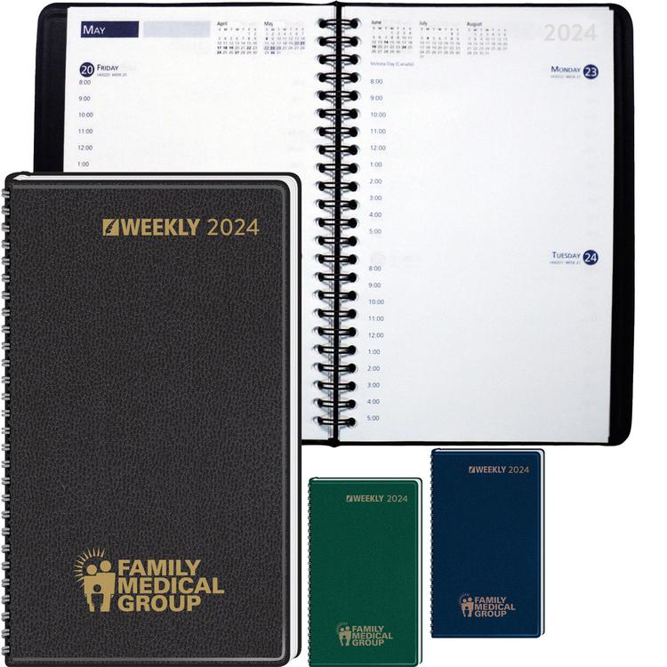 192 pages. 12 mos. (Jan.-Dec.). Hourly appointment schedule from 8:00 a.m. to 5:00 p.m. five monthly calendar blocks per spread and screened weekends. Includes three year reference calendar, holiday listing, future planning, full-year travel expense record, special information, conservation and recycling, first aid, unit and metric conversions, frequently used phone numbers, area codes and time zone/area code map. Printed on quality recycled paper with 30% post-consumer materials.